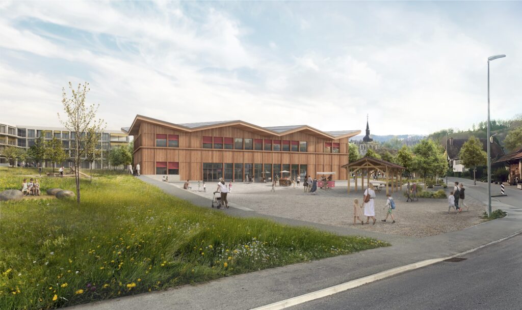 La proposition d’extension de la Résidence des Epinettes tisse de nouveaux liens avec le contexte environnant. L’agrandissement est découpé en deux ailes; la première au nord du site, proche de l’entrée, la seconde au sud, en direction du parc. Cette agrandissement en deux ailes permet de limité un impact important sur le parc. Le plan résultant remet au centre le bâtiment existant qui regroupe les fonctions principales de l’institution. La typologie proposée met en place des espaces de vies à l’échelle du bâti et contient les distances de liaisons entre les différentes fonctions. Ce traitement valorise l’ensemble du volume et pas uniquement une extension nouvelle connectée au bâti existant. La résidence pourra ainsi grandir, évoluant comme un tout cohérent en dialogue avec son contexte proche. La cour de récréation se développe dans le prolongement de la place du village, le long du chemin des Epinettes. Cette continuité permet de favoriser les échanges entre petits et grands. Les espaces sont pensées pour tous les âges et pour tout type d’activités. Les zones perméables sont favorisées afin d’éviter des îlots de chaleur. Des préaux couverts sont répartis sur l’ensemble de la cour afin de disperser les élèves. Des abris vélos sont répartis le long de du chemin des Epinettes, à proximité des entrées sur le site. De petites interventions au niveau des gradins et de la géométrie sont apportées à la place du village. Une perméabilité entre la place et l’église est garantie vers l’est grâce à l’implantation en redents et la volumétrie basse et du nouveau bâtiment.
